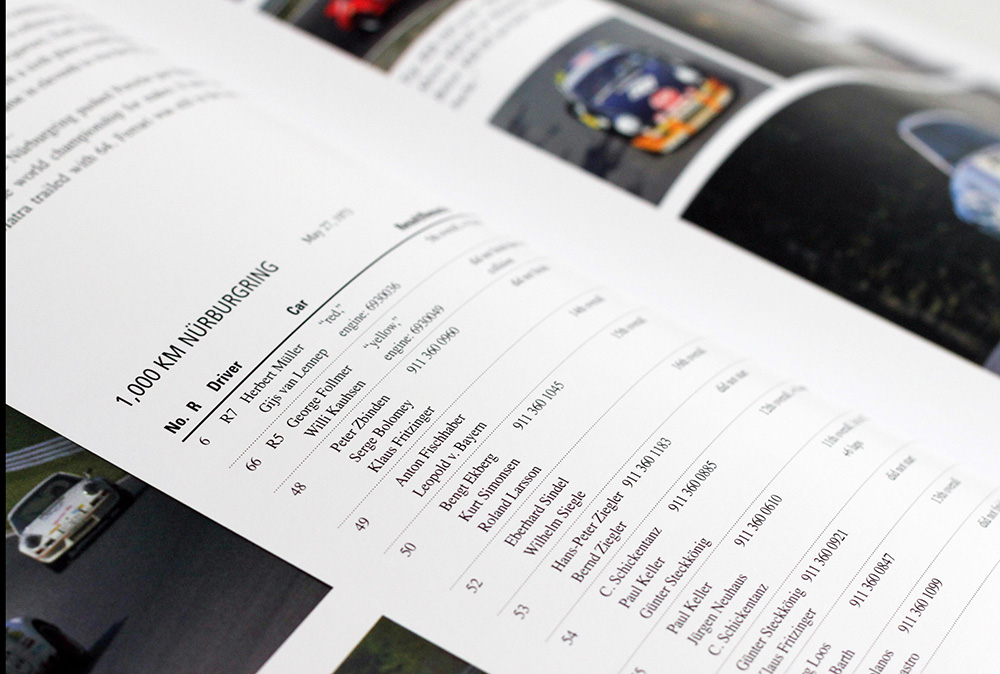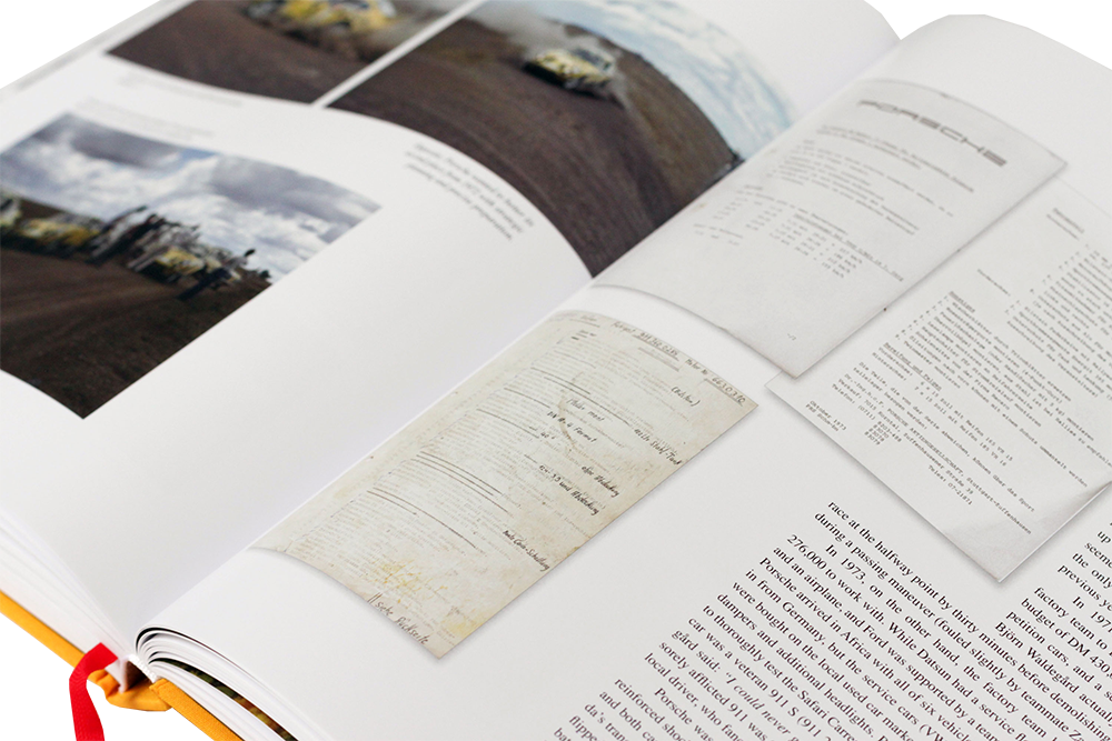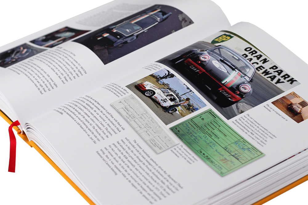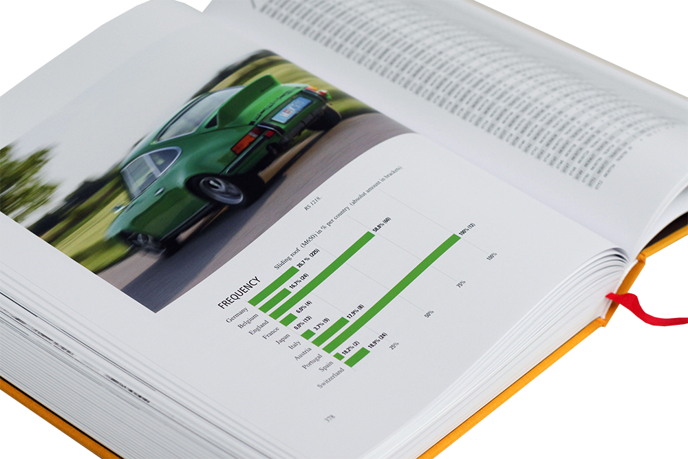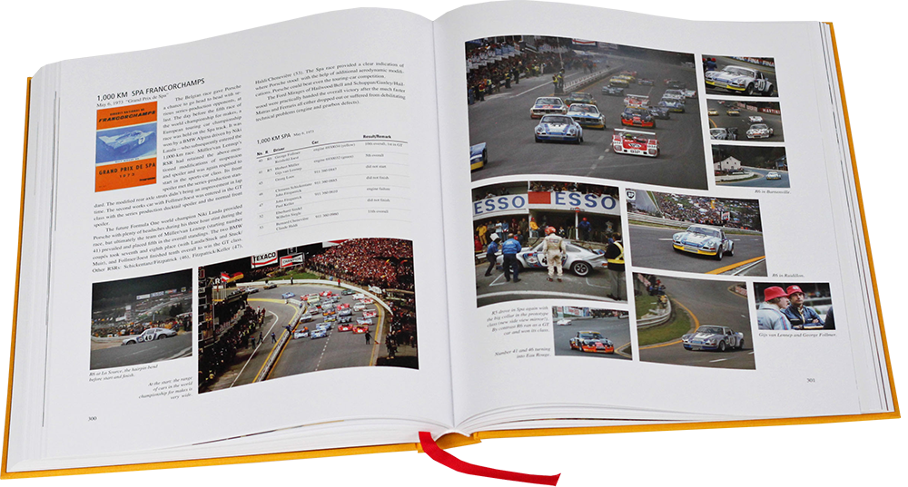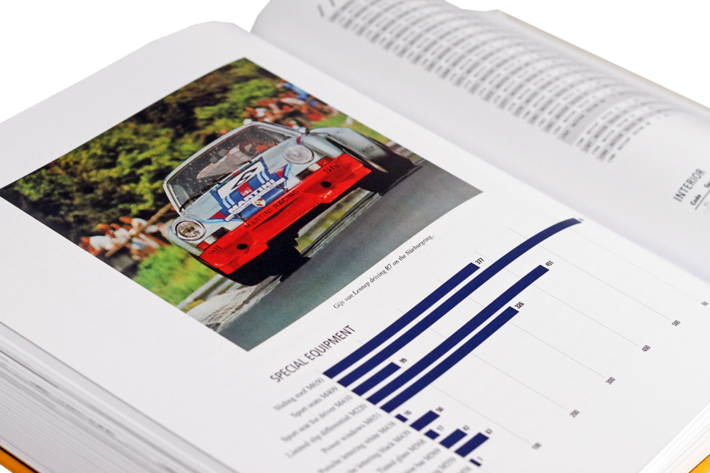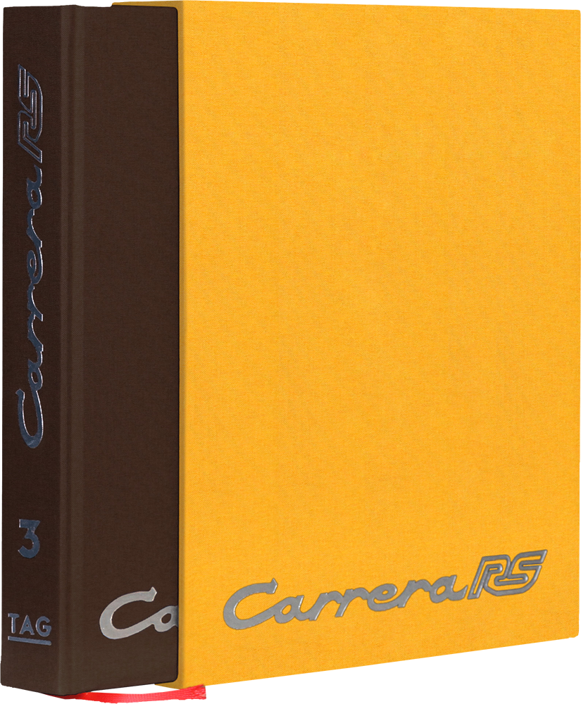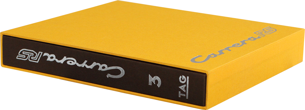 Der Text wird durch umfangreiches, großteils bisher unbekanntes Fotomaterial ergänzt. Den Abschluss des Werkes bildet eine komplette Auflistung aller 1.580 gebauten Carrera RS mit allen Produktionsdaten wie Originalfarben, Ausstattungen und Extras - ein ideales Nachschlagewerk für alle Liebhaber, Sammler und Restauratoren. Die 434-seitige deutsche Edition ist einzeln nummeriert und auf 3.000 Exemplare limitiert. Das Buch ist in braunem Leinen gebunden und wird von einem gelben Leinenschuber geschützt.