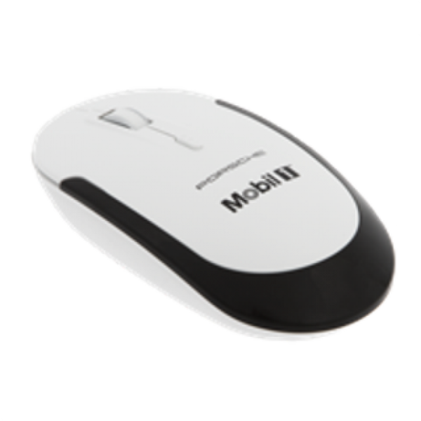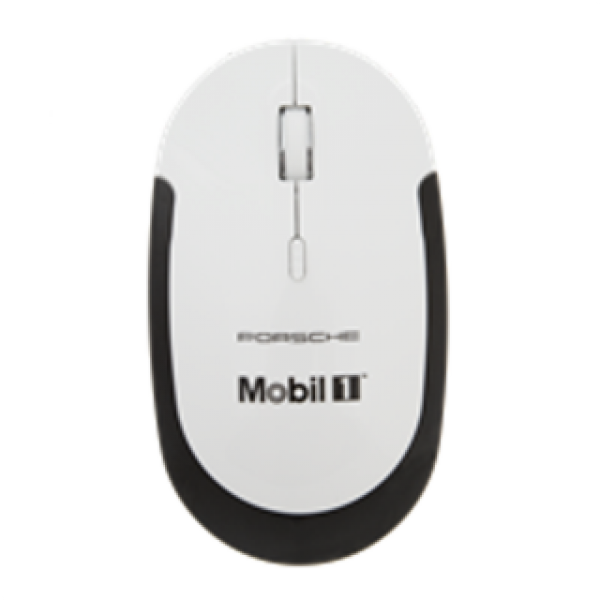 Weiße, kabellose Computer-Maus mit schwarzen Verzierungen sowie aufgedrucktem Porsche und Mobil 1 Logo, mit geringem Batterieverbrauch und längerer Batterielaufzeit. Ermöglicht gleichzeitigen Anschluss von 3 Geräten.