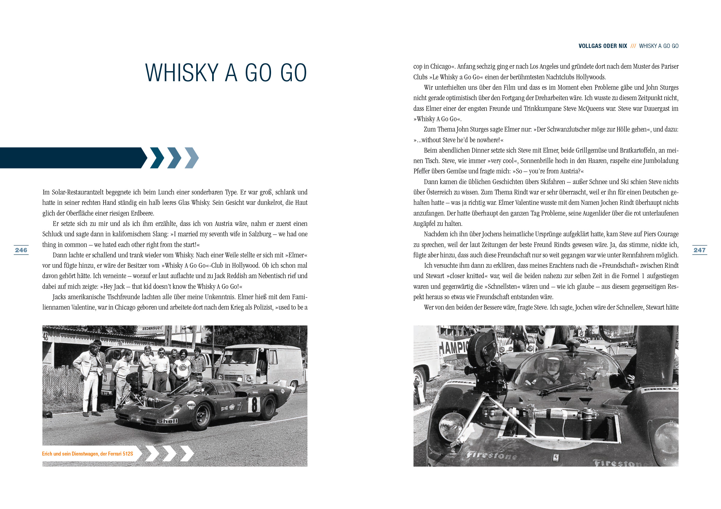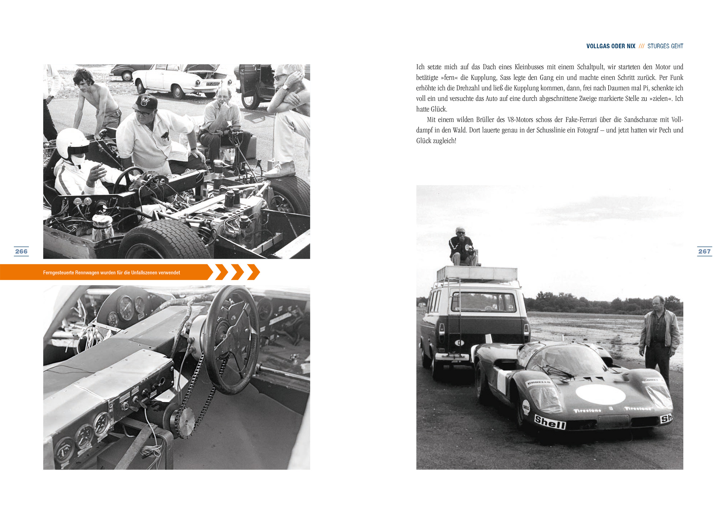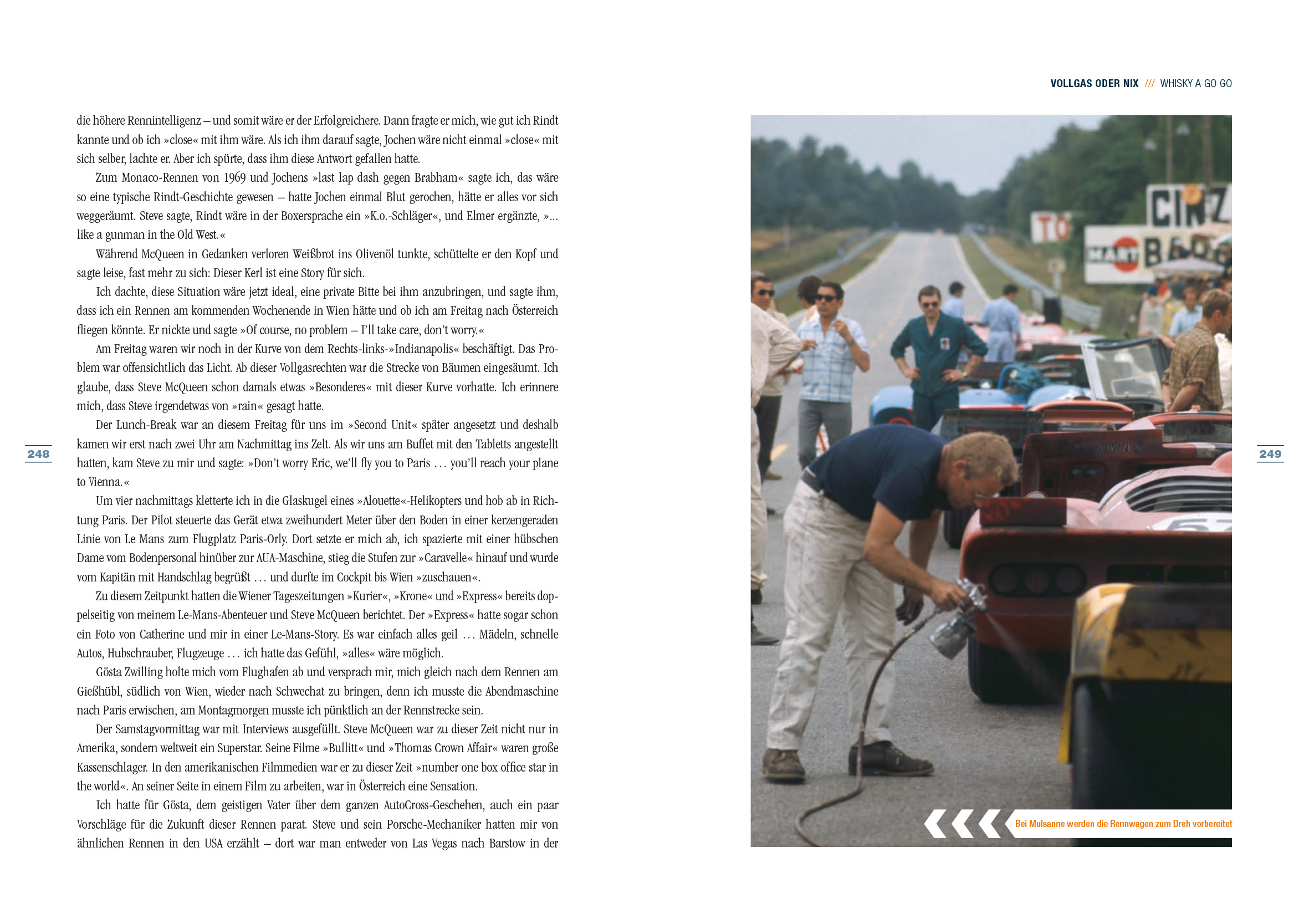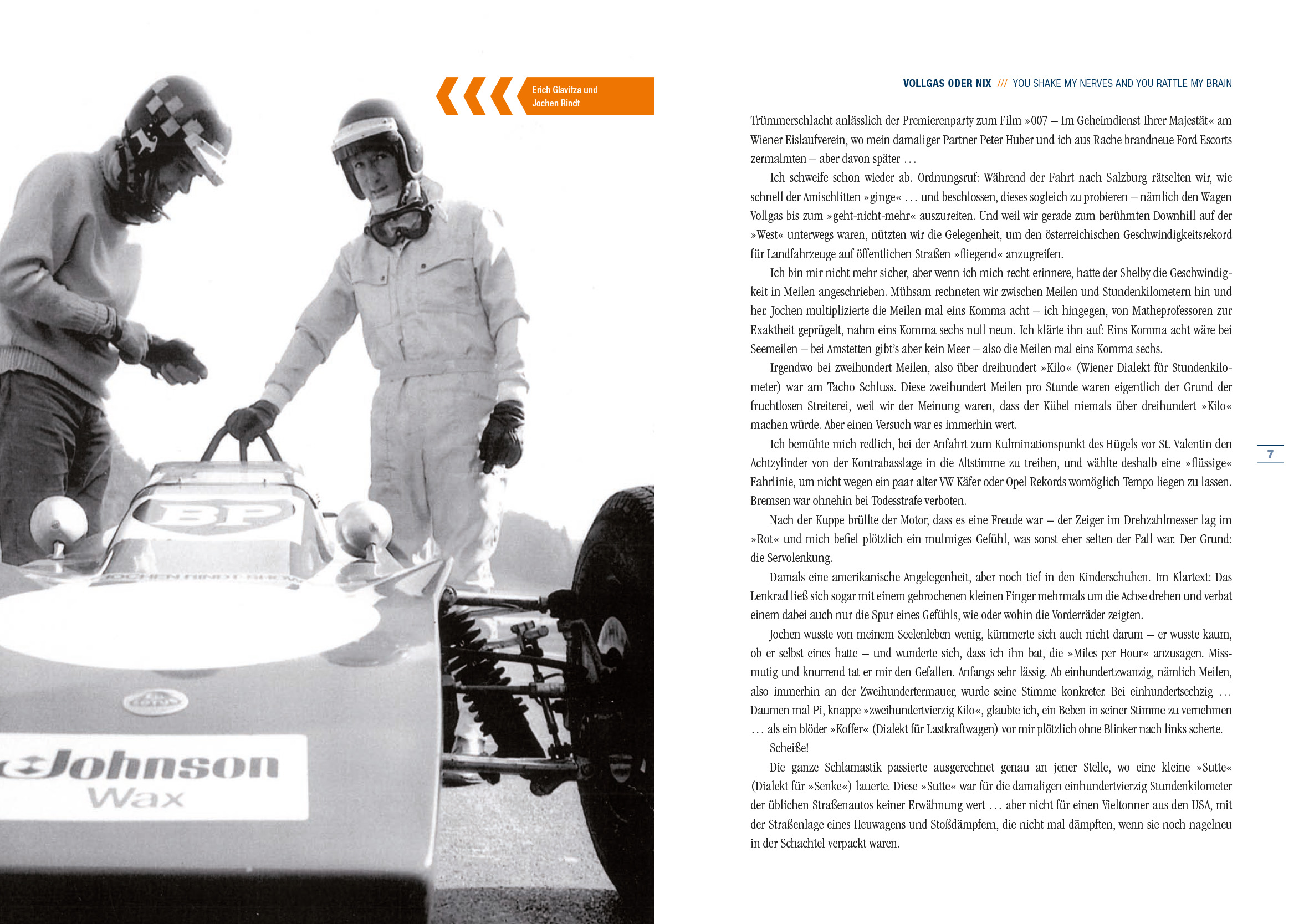 In diesem Werk erzählt er die Geschichten, die andere lieber verschweigen: Wie Jochen Rindt und er die Höchstgeschwindigkeit eines Ford Mustang auf einer abschüssigen Autobahn ausloten – und diese wegen eines ausscherenden Sattelzugs fast mit dem Leben bezahlen. Wie er Bond-Girl Diana Rigg das Driften in einem 400 PS starken Mercury-Cougar beibringt. Und wie Steve McQueen bei den Dreharbeiten zum Le-Mans-Film ein Liebespaar samt Anhänger entführen lässt.