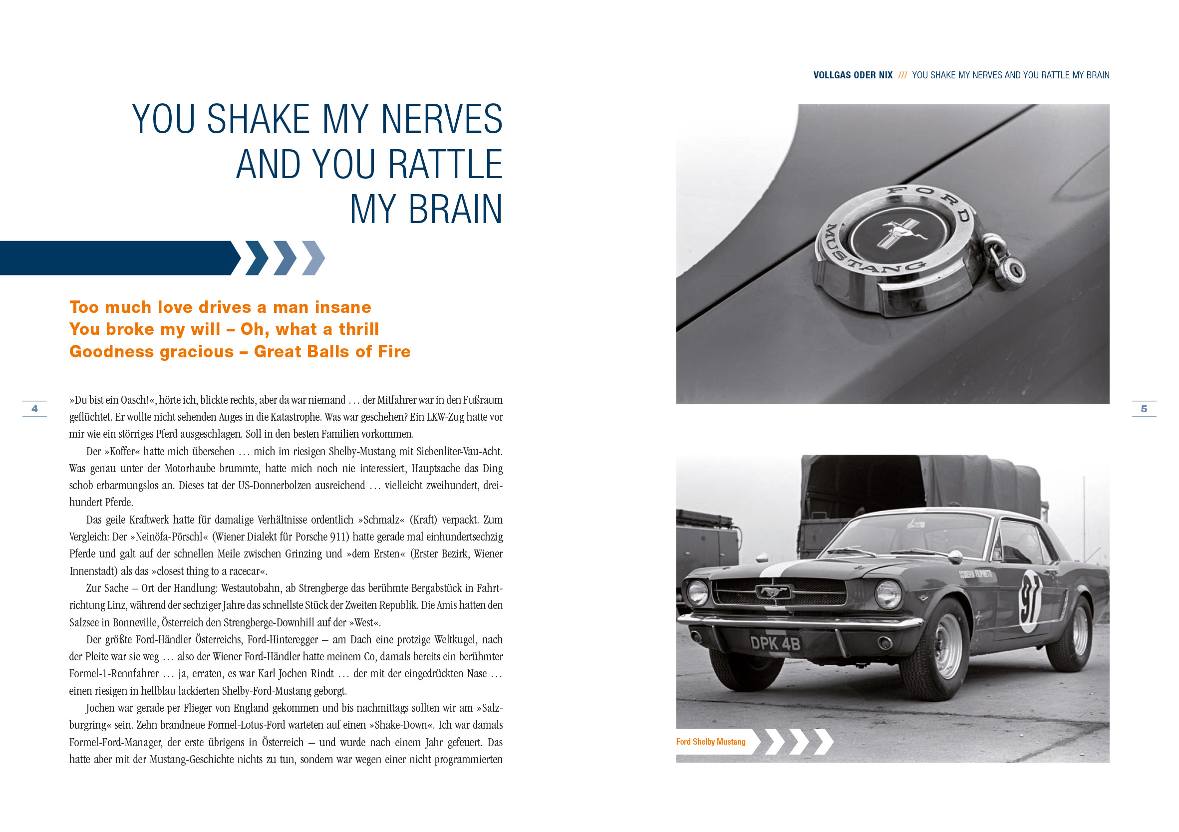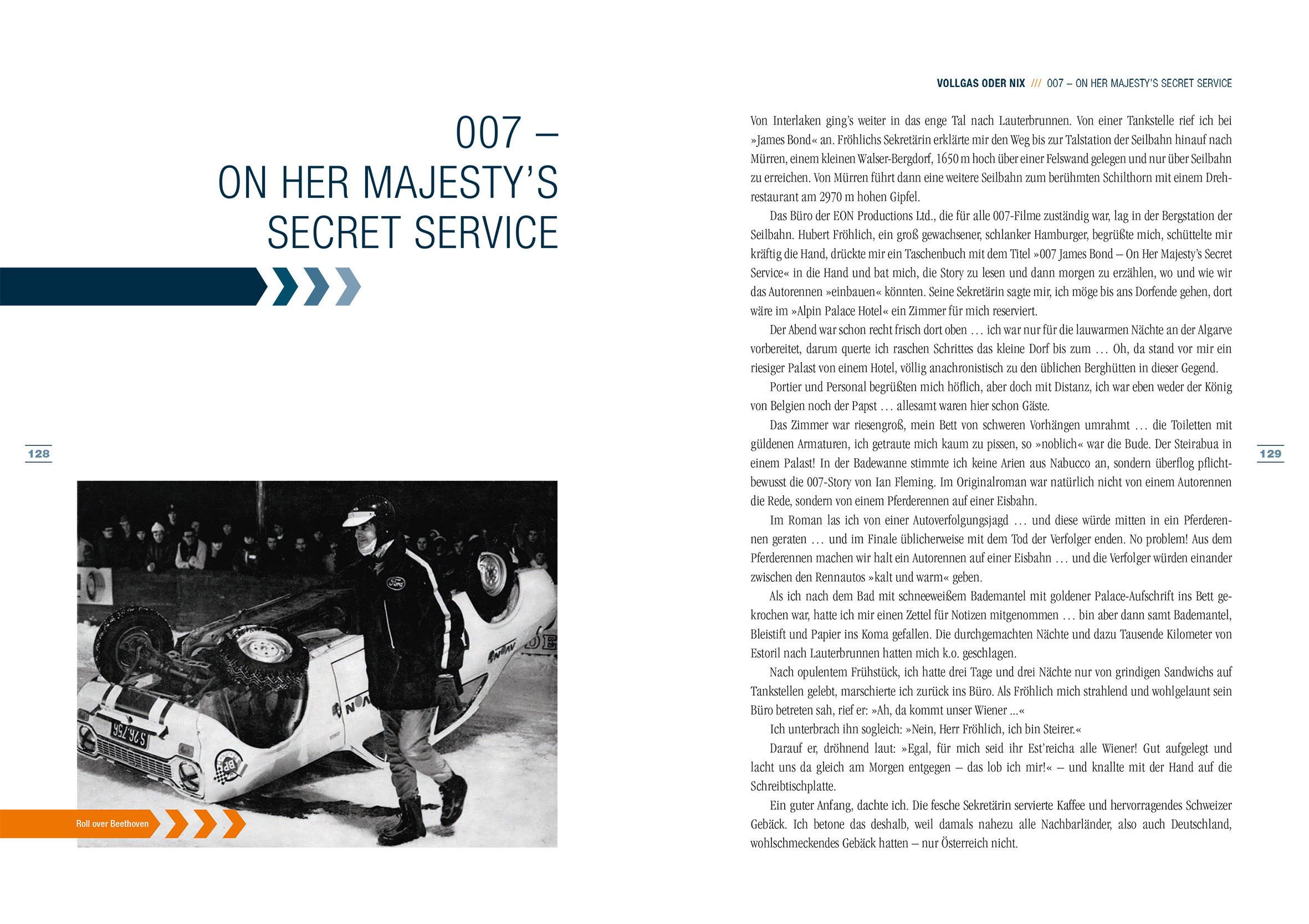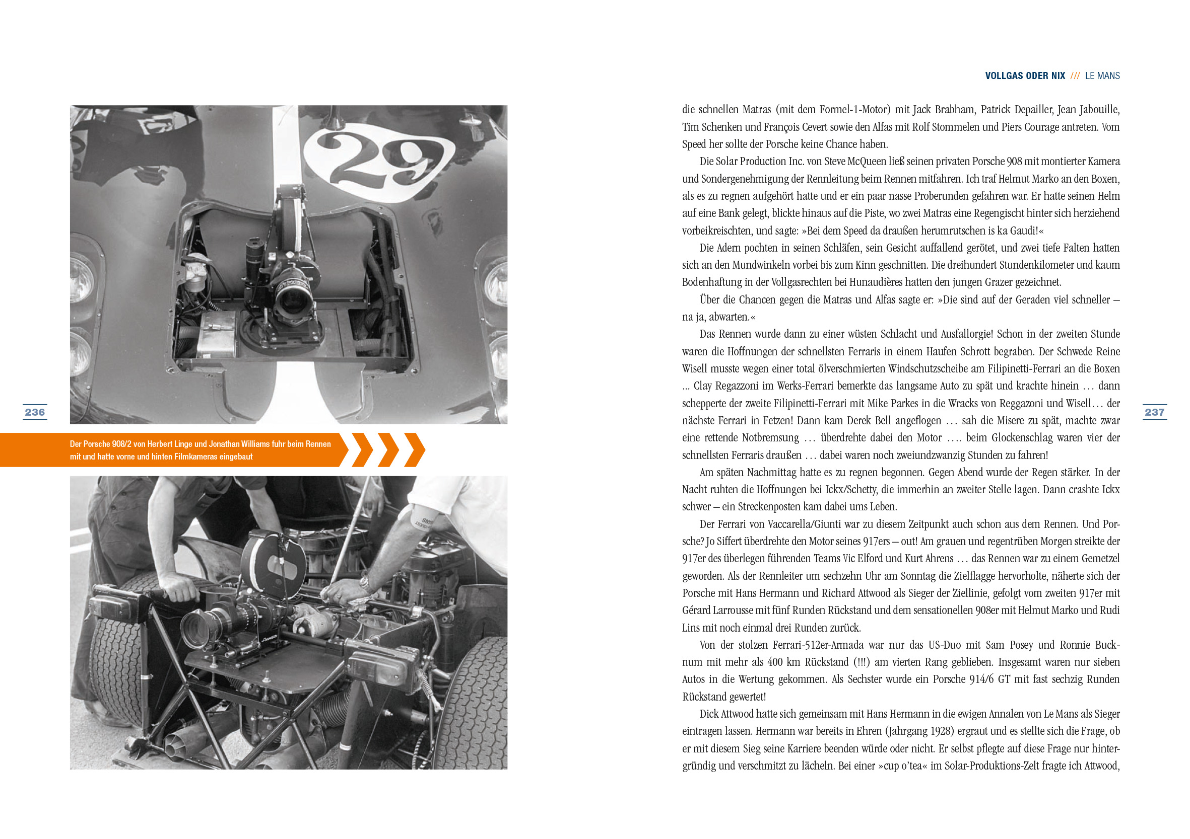 In diesem Werk erzählt er die Geschichten, die andere lieber verschweigen: Wie Jochen Rindt und er die Höchstgeschwindigkeit eines Ford Mustang auf einer abschüssigen Autobahn ausloten – und diese wegen eines ausscherenden Sattelzugs fast mit dem Leben bezahlen. Wie er Bond-Girl Diana Rigg das Driften in einem 400 PS starken Mercury-Cougar beibringt. Und wie Steve McQueen bei den Dreharbeiten zum Le-Mans-Film ein Liebespaar samt Anhänger entführen lässt.