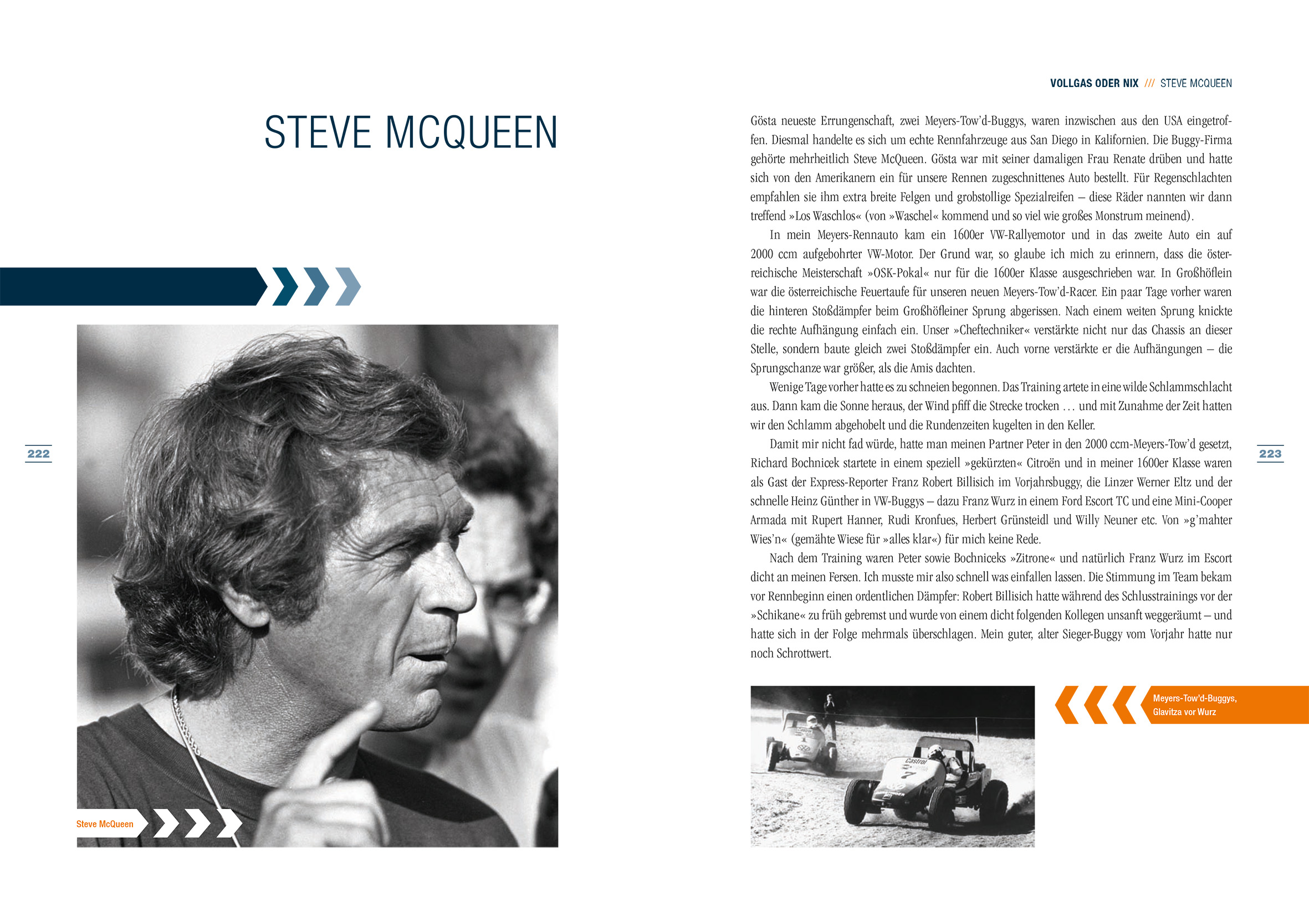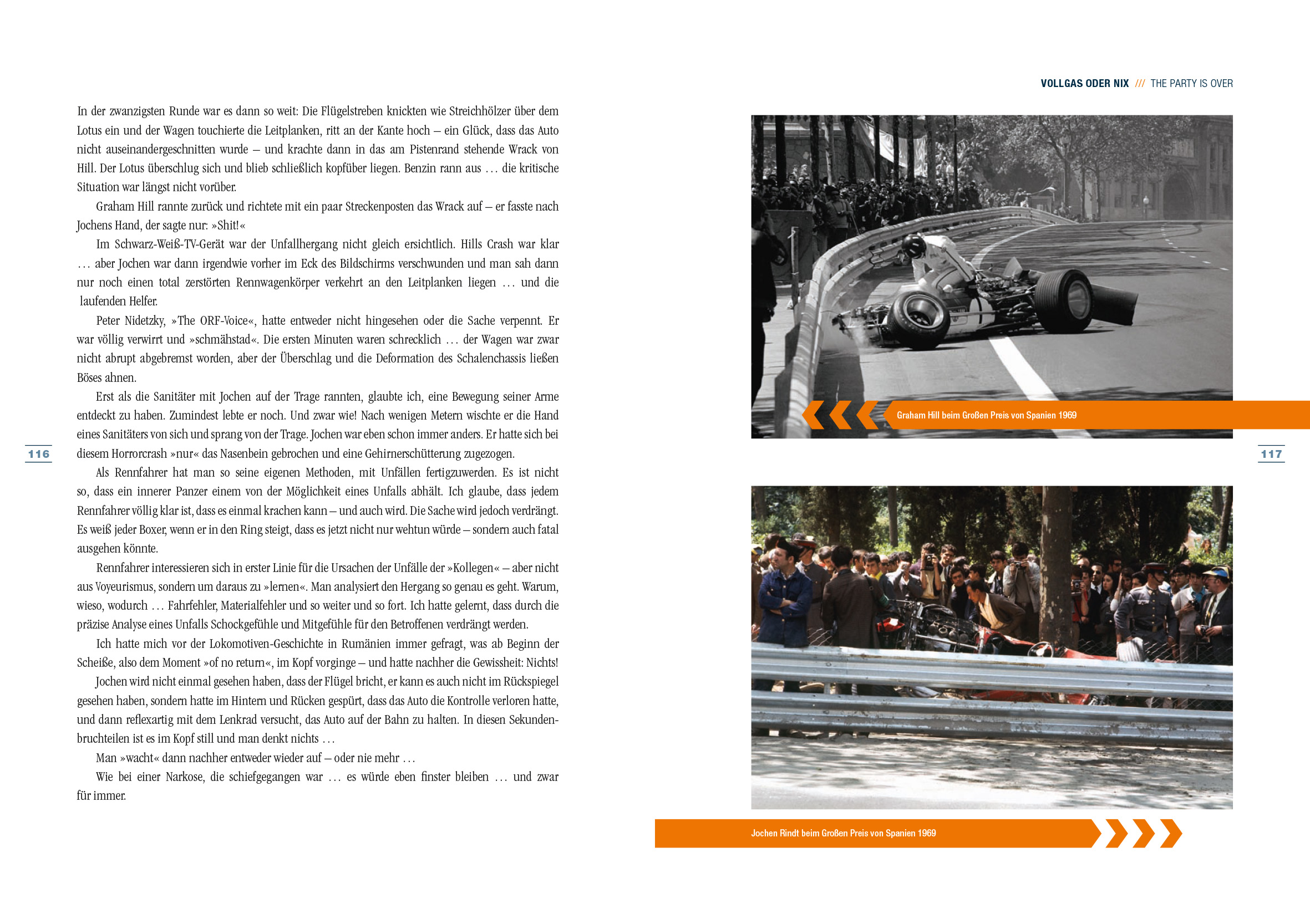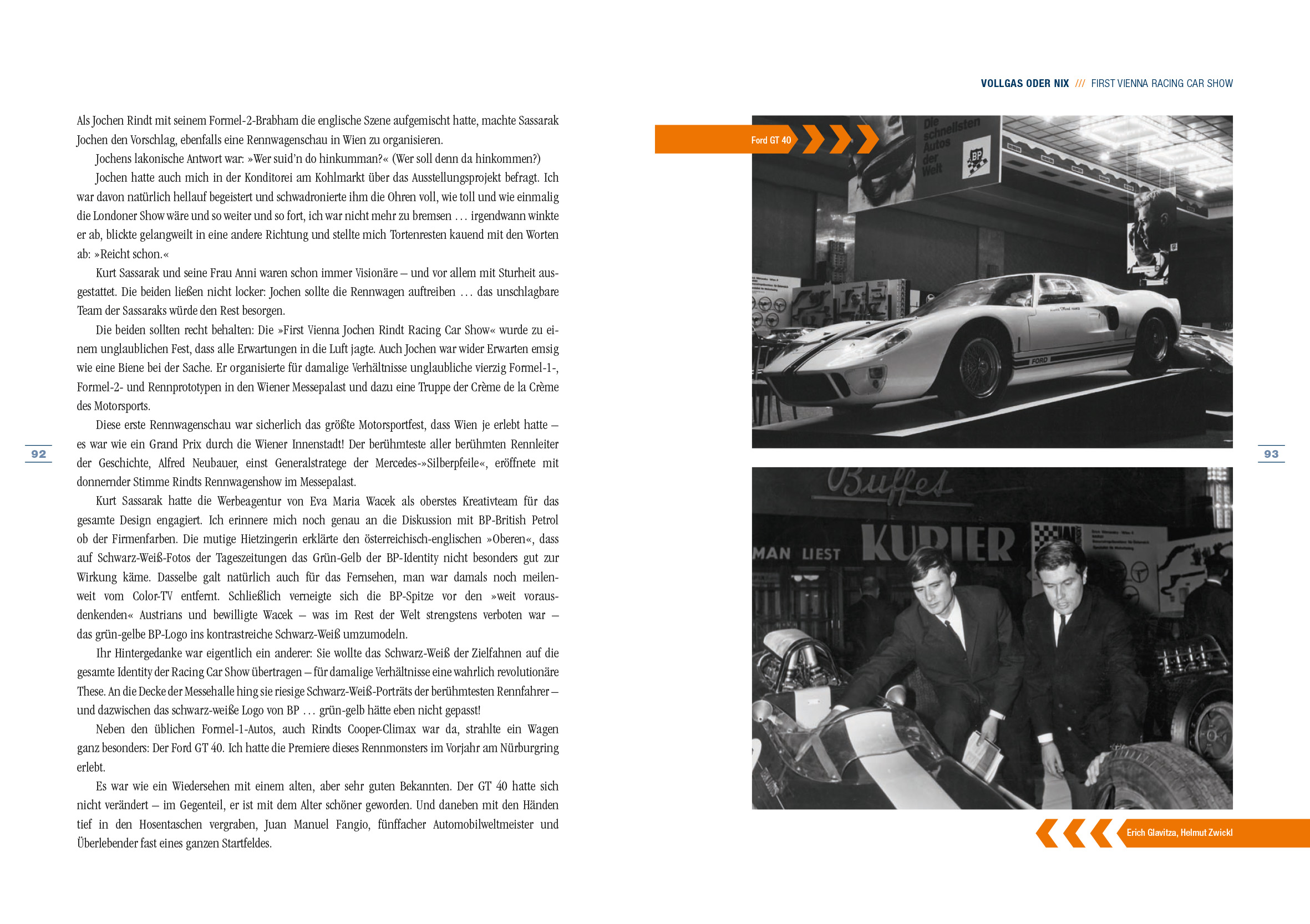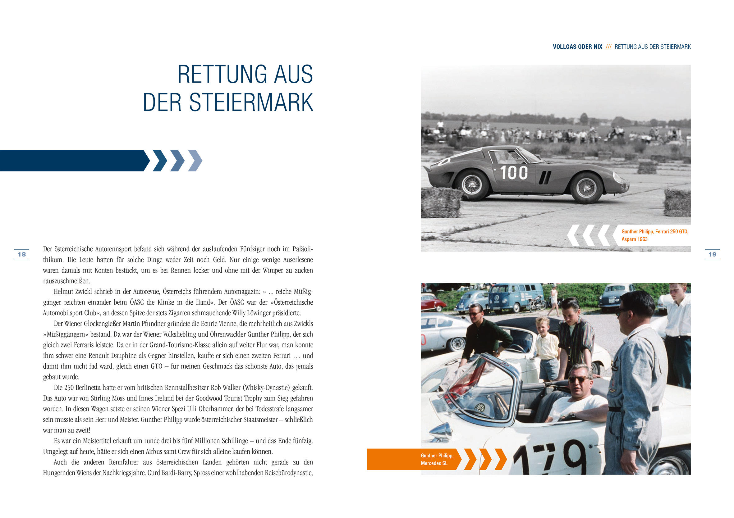In diesem Werk erzählt er die Geschichten, die andere lieber verschweigen: Wie Jochen Rindt und er die Höchstgeschwindigkeit eines Ford Mustang auf einer abschüssigen Autobahn ausloten – und diese wegen eines ausscherenden Sattelzugs fast mit dem Leben bezahlen. Wie er Bond-Girl Diana Rigg das Driften in einem 400 PS starken Mercury-Cougar beibringt. Und wie Steve McQueen bei den Dreharbeiten zum Le-Mans-Film ein Liebespaar samt Anhänger entführen lässt.