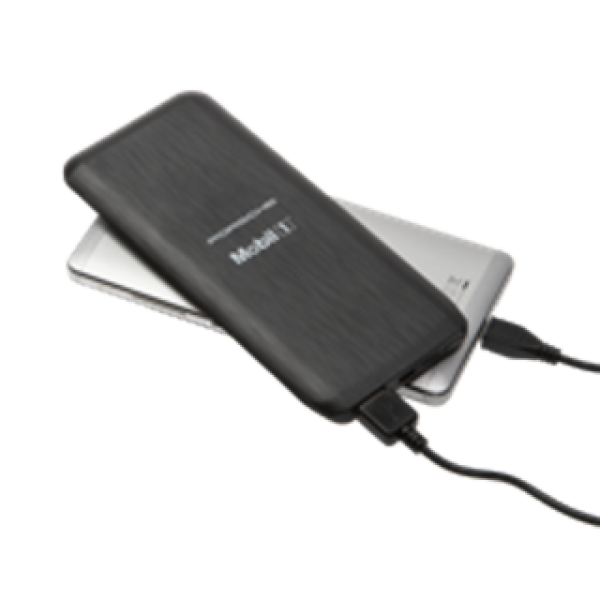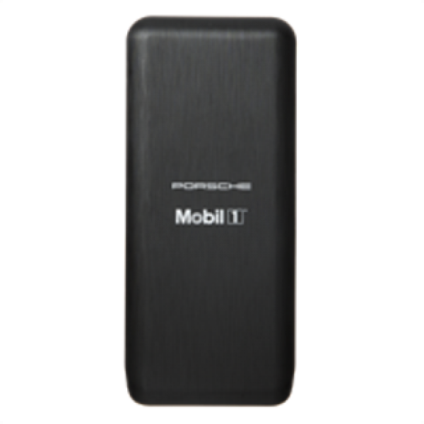 Schwarzes Ladegerät bedruckt mit weißem Mobil 1 und Porsche Logo.